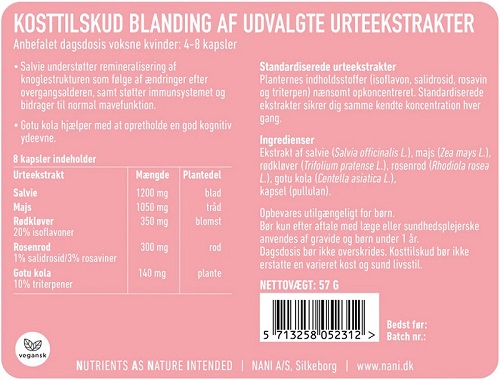 Ingredienser: Ekstrakt af salvie (Salvia officinalis L.), majs (Zea mays L.), rødkløver (Trifolium pratense L.), rosenrod (Rhodiola rosea L.), gotu kola (Centella asiatica L.), kapsel (pullulan)