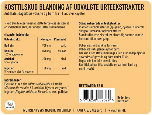 Ingredienser: Ekstrakt af rød elm (Ulmus rubra Muhl.), kamille (Chamomilla recutica L.), artiskok (Cynara scolymus L.), ingefær (Zingiber officinalis Roscoe), kapsel: Pullulan