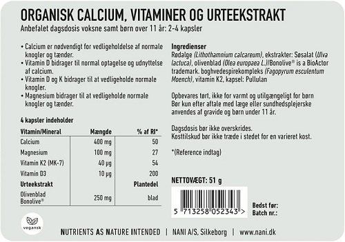 Calcium er nødvendigt for vedligeholdelsen af normale tænder og knogler. Nani Calcium er udelukkende udvundet fra rødalger, da disse foruden et naturligt højt indhold af organisk bundet calcium også indeholder andre mineraler, herunder magnesium.